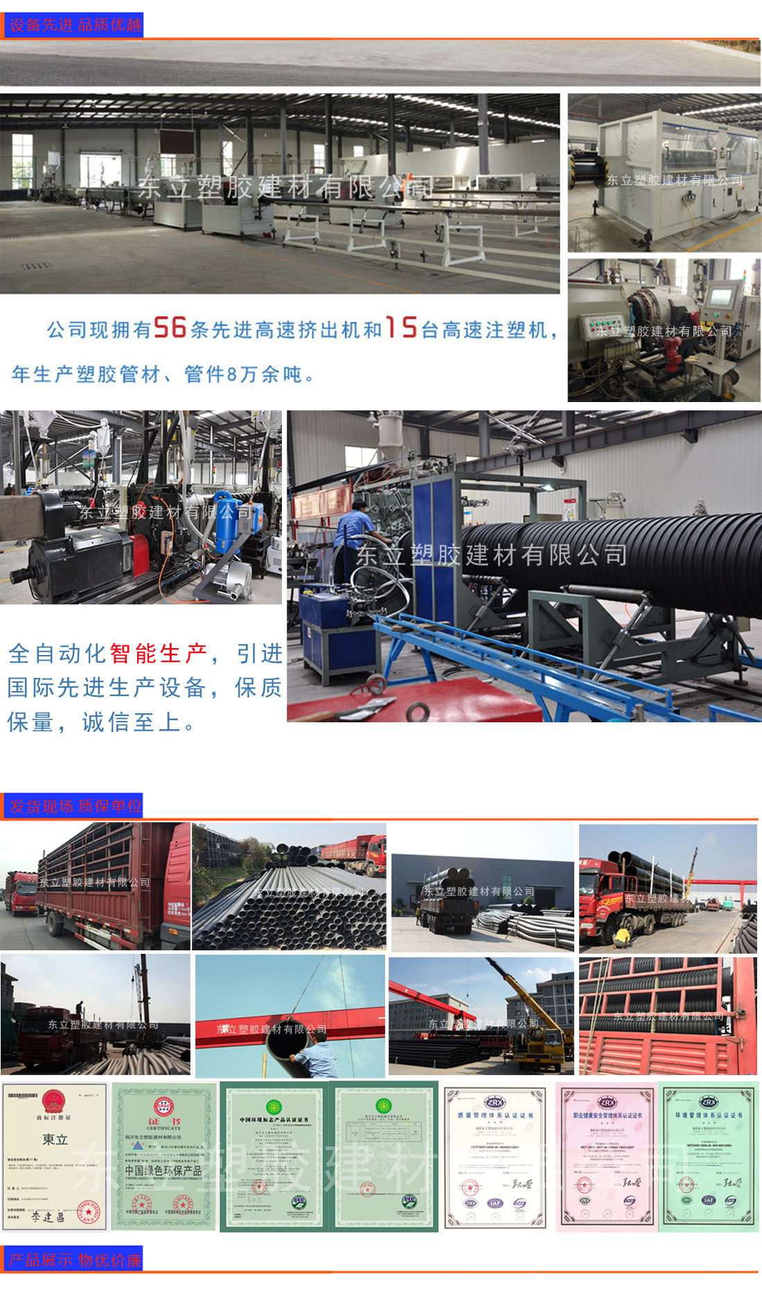 PE拖拉管采用目前世界上最先進的技術生產制造的,具有高速擠出成型,熔融適度,自動定尺切割,PLC控制生產全過程的先進性能。