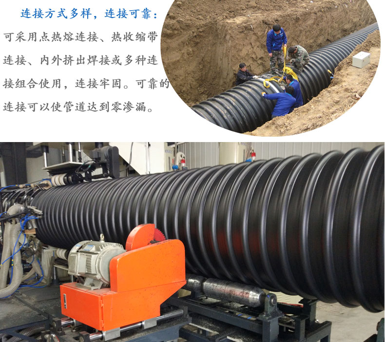 1.連接方式多樣,連接可靠 :可采用電熱熔連接、熱收縮帶連接、內外擠出焊接或多種連接組合使用,連接牢固。可靠的連接可以使管道達到零滲漏。